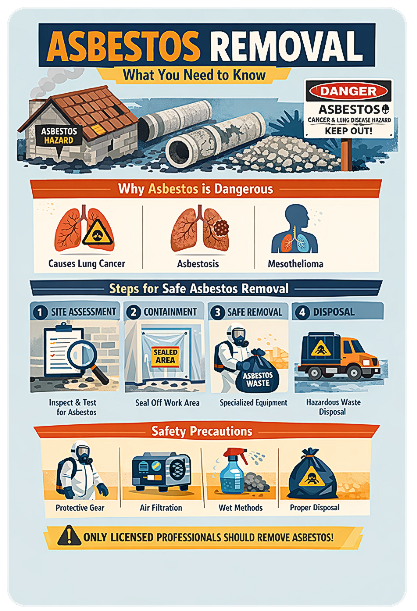 Asbestos is a very serious danger and should only be handled by professionals that have the proper knowledge and protective gear to remove it safely.
